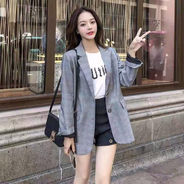 LOOK1:想要提升造型的时尚感,女生可以为自己选择一款融入了经典元素的西装。随着服饰领域的发展,现在有很多专门为女性设计的西装,适合女生在日常穿搭。女生可以为自己选择一件灰色的格纹西装,颜色经典低调,格纹元素时尚经典,穿起来提升造型的时尚感,剪裁利落大方。里面可以搭配一件白色的短袖,颜色清爽百搭,中间增添了英文图案让造型更具时尚感,搭配起来有层次感。下身搭配一条黑色的高腰短裤,颜色经典百搭,穿起来拉长女生身型,显腿长,打造出了时尚有范的初秋造型。
