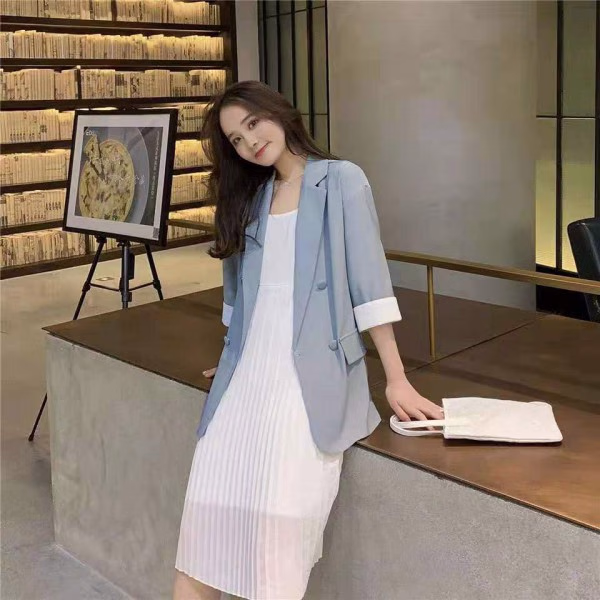 LOOK2:一些清爽色系的单品在秋天穿搭可以提升造型的舒适度,女生可以尝试为自己选择一件蓝色的西装外套,颜色清爽干净,剪裁利落大方,穿起来提升造型的气质。里面可以搭配一条白色的雪纺连衣裙,颜色清爽百搭,组合搭配起来凸显出女性柔美的气质。女生可以为自己选择一双单鞋,呈现出清新时尚的秋日造型!