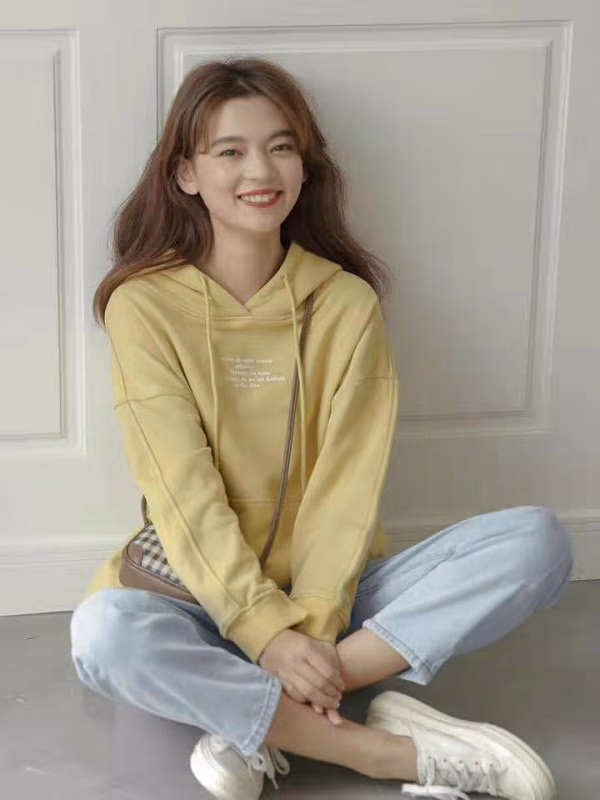 卫衣是一款休闲单品,在秋冬季节经常能够看到它的身影。秋天女生运用亮色系的单品可以让自己的造型更出众。女生可以为自己选择一件黄色的连帽卫衣,颜色明亮有活力感,连帽设计增添了造型的休闲感,穿起来活力减龄。搭配一条浅色系的牛仔裤,率性时尚,色调清爽柔和。搭配一双小白鞋,呈现出清爽靓丽的秋日造型!