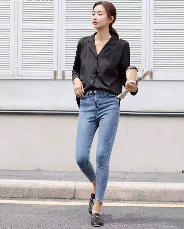 一款质感的衬衣,可以让造型看起来更有气质。通勤造型可以优选简约风的单品,一款黑色的衬衣,颜色经典百搭,版型简约显气质,穿起来有质感。搭配一条简约风的修身牛仔裤,牛仔元素率性时尚,修身设计更显身材。搭配一双黑色的单鞋,与衬衣的颜色呼应起来,打造出了气质型的通勤造型!