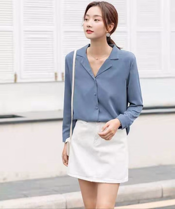 初秋同样也可以打造出清新感的造型,女生可以为自己选择一件灰蓝色的衬衣,颜色低调清爽,穿起来知性显气质。搭配一条白色的半身短裙,颜色清爽干净,穿起来拉长女生身型,显腿长!呈现出了清爽的气质通勤穿搭!