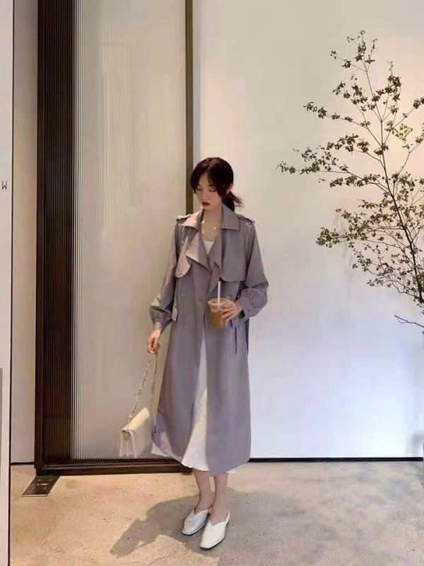 穿搭风衣行走在大街上的时候,秋风吹起衣摆的时候可以显现出女性的气质,让造型看起来更有气场。秋天也可以选择一款清爽色系的风衣来打造出气质感的秋日造型,香芋紫浪漫清新,女生可以为自己选择一件长款香芋紫色的风衣,色调柔和清新,女生穿搭起来更具温柔感。里面女生可以搭配一件白色的连衣裙,颜色清爽干净,穿起来提升造型的气质感,与风衣组合搭配起来有层次感。搭配一双白色的包头拖鞋,呈现出了清新显气质的秋日造型!