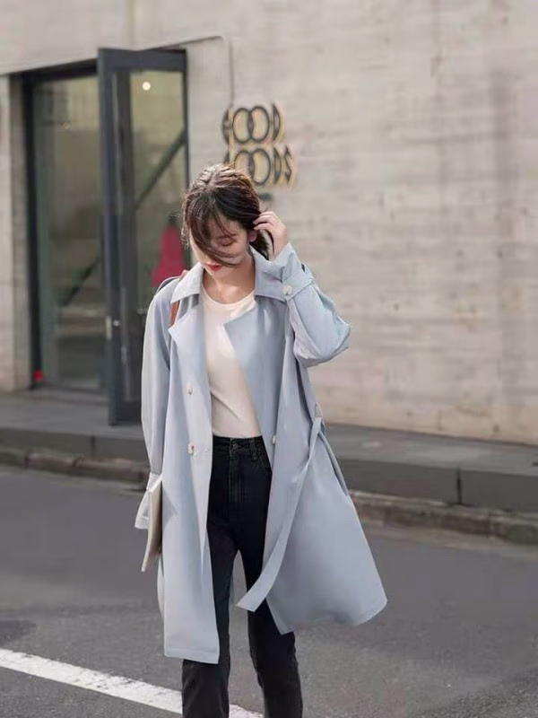蓝色清爽干净,视觉上看着也很舒适,女生可以尝试为自己选择一件蓝色的风衣来打造出清爽显气质的秋日造型。女生可以选择一件中长款的蓝色风衣,色调清爽,版型简约大气,里面可以搭配一件白色打底衫,简约百搭。下身搭配一条深色的牛仔裤,率性时尚,修身效果显身材。