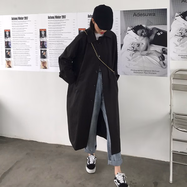 中长款风衣的长度一般是70~80cm之间,穿上身下摆在大腿到膝盖的中间这部分徘徊。对我们普通人来说,一定要注意一点:风衣的长度不能刚好卡在膝盖上!不然会把腿长分割五五分割地很彻底,你的小腿到底有多长,会一览无遗。越往高,越显高。但这要在盖过臀部的前提下,不然梨形身材肉肉比较集中的大腿和臀部可就没得可挡了。或者稍微在膝盖下一点,哪怕一点点效果都会好,大家会更多关注这件衣服,不会把过多的注意力放在你的身材上。