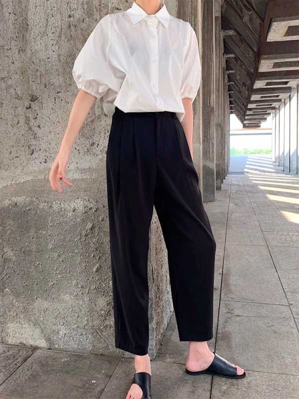 萝卜裤和衬衫的搭配有点酷,看上去有点BF风,萝卜裤给人的感觉和西装裤有点类似,和衬衫搭配,恰到好处的满足职场穿搭,简约不夸张,这样的搭配,看上去非常的时髦!