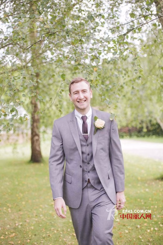 灰色与白色的搭配总给人一种大气又时尚的感觉,如果再恰到好处的搭配一条酱紫色领带,穿搭出层次感,想必新郎在婚礼当天也是非常受人瞩目的!
