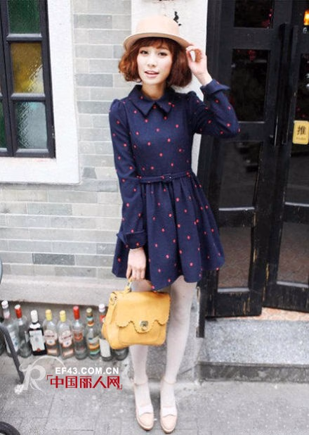 小清新女生看这边,一条连衣短裙款式是,深蓝色的颜色玫红色波点点缀,让深色系也可以变得时尚大方,正适合时尚女性的我,这款服装连衣裙娃娃领的设计,呢子面料,在秋季即不会感觉凉意,也不会感觉特别的厚重,配上一条白色打底袜那就更完美了。