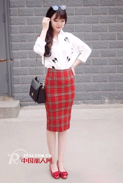 白色衬衫,经典不败的设计,穿在身上简单好看,给人的感觉格外的清新秀气,搭配红色格子半身裙,是铅笔裙的设计,勾勒出曼妙身姿,穿着大红色平底鞋,链条包,干练优雅。