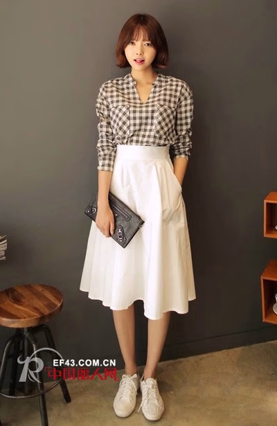 黑白灰格子衬衫,复古文艺范儿的风格,穿在身上格外小清新,搭配白色高腰半身裙,如此优雅大方的,轻松穿出都市OL的味道,踩着白色球鞋,大方有型。