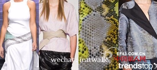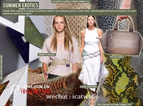 用爬行生物的皮改造成像黄绿色和乳白色交叉重现夏季里的影迹斑斑效果,T台展示的服装要么部分运用,要么整件都运用了这个元素。For Me Elena Miro长裙在纯白色上采用灰绿十字交叉,打造出一种优雅感。米兰时装周和加布里尔.考兰格路都选择了全身统一材质,在其柔软束腰外衣和双色夹克设计上可看出。