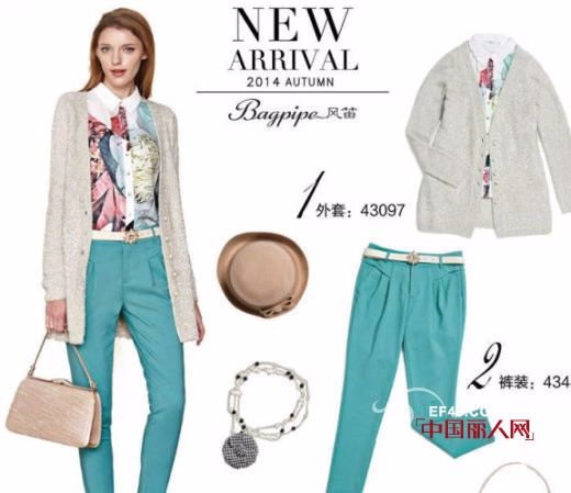 奶咖色的外套和松石绿长裤形成强烈的撞色对比,营造视觉上的跳跃感,休闲中又不失型格魅力的搭配让你特别有魅力,国庆出游,这套装扮让你尽享旅途乐趣。