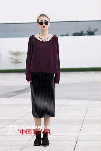 酒红色宽松套头针织,竖条纹长裙,配上黑色短靴,说不出的惊艳感。暗色系的搭配令人印象深刻。