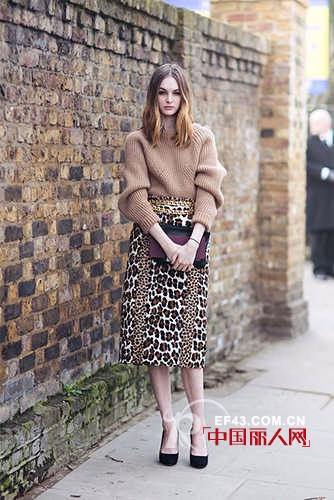 霸气豹纹拼接高腰裙穿出清新感,中性风格针织衫+黑色手拿包+黑色高跟鞋。时尚大气,端庄优雅,你敢试试吗?