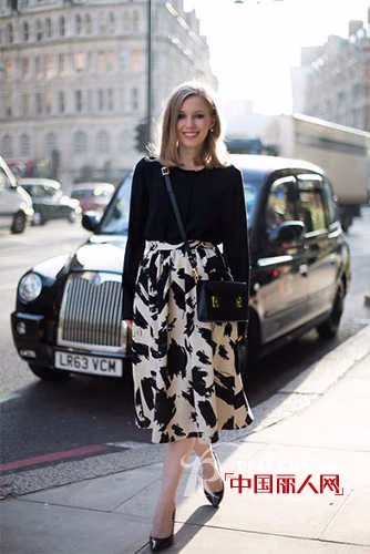 黑色针织衫搭配黑白图案的长裙非常高级耐看,由于这种长度的长裙没有短裙和到地的长裙那样优化比例,需要像这样提高腰线以及搭配高跟鞋。