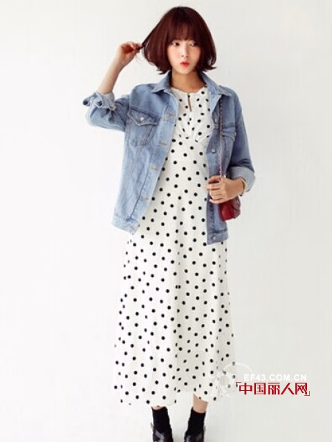 宽松版型牛仔外套,经典百搭,带点日韩风格,清新养眼。选择黑色波点白色长裙来搭配,透着小清新范儿,十分显气质。搭配黑色短靴,帅气又有个性。