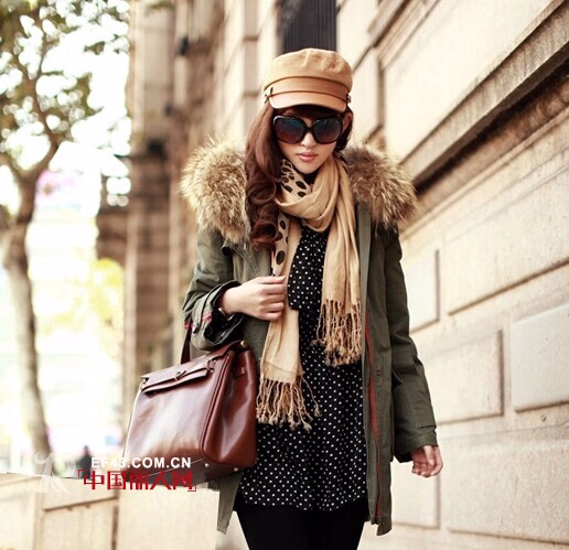 女生的军大衣当然不可能像男款那样厚重,在设计上要来得更为精巧一些,比如这位MM身上这款军大衣就蛮不错的,毛毛领的设计更添了几分可爱的感觉,而背后采用的收腰设计也让这款军大衣显得不会太臃肿,女孩子穿起来会漂亮许多。