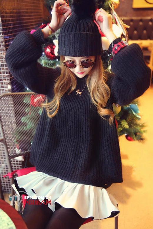 最百搭不过黑色毛衣,一点点的款型设计就会让整件衣服非常的出色,百搭,这款的喇叭袖锁口设计,宽松的娃娃版,配上百褶裙,好漂亮~再戴个帽子,瞬间减龄啦