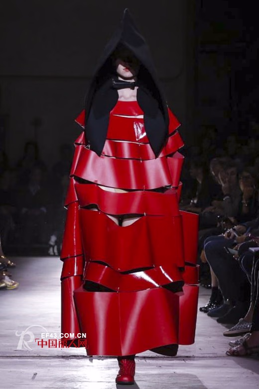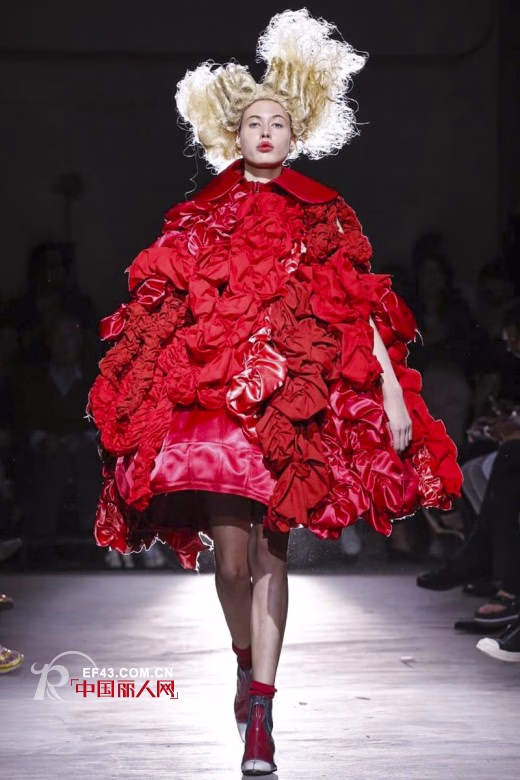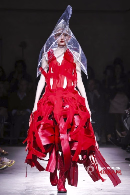 COMME des GARCONS此次发布的新品系列将不对称层叠设计发挥的淋漓尽致,艳丽的红色加上充满立体建筑结构的布条缠绕,再加上模特们搞怪而又极具个性的发型,一起营造出了淡淡的宗教感,整个秀场仿佛一群红魔在T台上用服装诉说着她们虔诚的信仰,让人印象很是深刻。