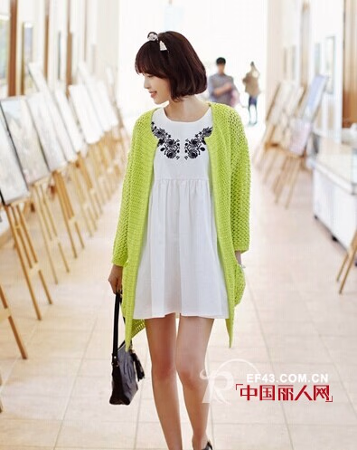 荧光绿针织开衫吸睛抢镜,而粗针的设计让这款针织衫更多了几分镂空的感觉,中长款的设计轻松帮我们遮住了多余赘肉,搭配白色高腰印花连衣裙一起穿着,显得清新可人。