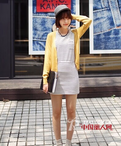 姜黄色针织衫吸睛抢镜的同时也给人很温暖的感觉,搭配黑白条纹连衣裙一起穿着,整体look显得清新自然又舒适大方,这样柔美又舒适的搭配,出游时穿搭再适合不过了。