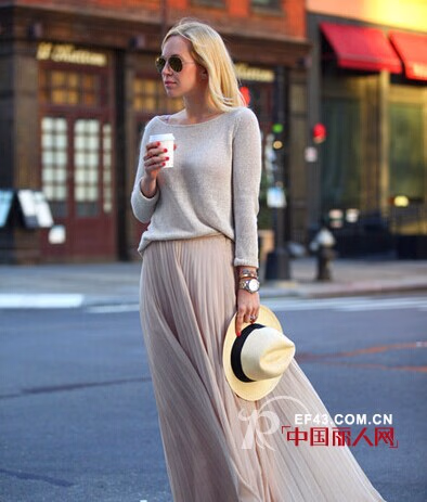 裸色针织衫休闲舒适,略略宽松的版型遮肉显瘦的同时也带出了几分秋日的慵懒风情,搭配浅粉色雪纺百褶长裙一起穿着,整体look休闲淑女,浪漫飘逸。
