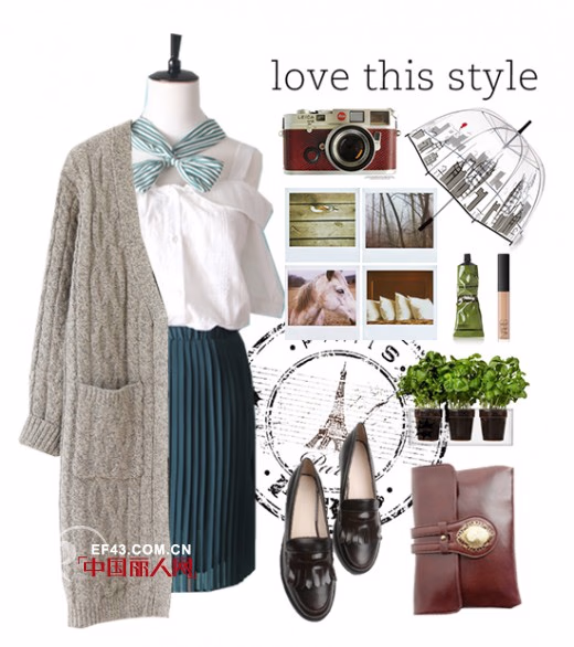 森女系的服装部一定要有效碎花、大地色之类的。讲的的纯色也能穿出不一样的味道。就如这件灰色的粗线毛衣,大气简洁的口袋设计,很有大牌范,搭配白色的甜美吊带娃娃衫+绿色的百褶半裙。脚上黑色的单鞋,这样的优雅复古范儿也可以很森系哦。