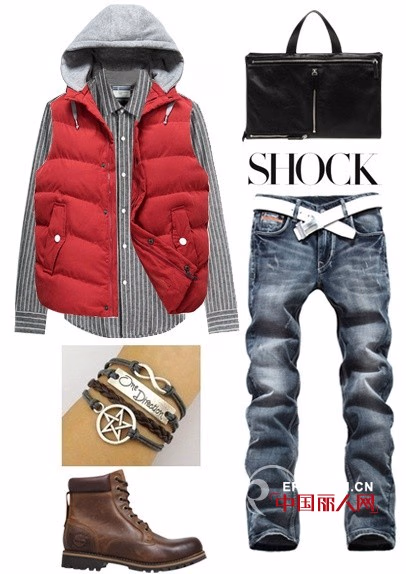 不管你是什么风格首选你要选择一款马甲款式,红色马甲是白看不厌的颜色,而红色对于男士来说也是很有回力的一个颜色,这款羽绒马甲款式连帽的设计内搭一件条纹衬衫,潮味十足,配上休闲牛仔裤,一款手提包绝对很有感觉。