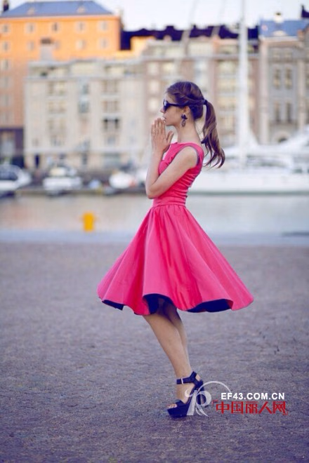 玫红色,一款女生都喜欢的颜色,这款连衣裙的版型就是上小下大的款式,上身的修身设计拼接下摆的蓬蓬造型,伞裙的形式设计配上黑色高跟鞋,绝对很显气质,扎上马尾街头风格尽显魅力。