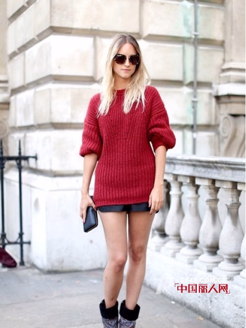 红与黑是永不过时的经典搭配。这件酒红色的宽松套头毛衣搭配上黑色的超短裤和黑色的拼接短靴,很显身高。而且在秋天这样的装扮还能营造着出学院风的感觉,特别适合正在上学的女生,当然同时也适合各年龄层的女生当作休息日的休闲穿搭。