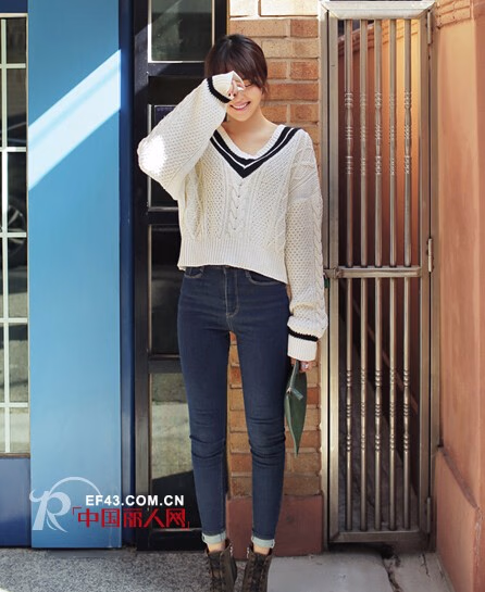 魅力针织衫,深V领,配色很有学院风的感觉,很减龄的款式,宽松的短款设计,下身搭配高腰修身牛仔裤和系带短靴,完成了干练利落范儿。