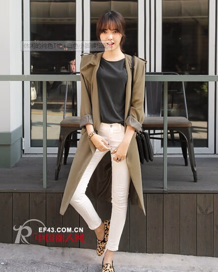 休闲的纯色T恤+白色小脚裤搭配,外搭质感高端的长款风衣外套,肩部有肩章的细节设计,很帅气的细节,打造了酷感拉风的秋季范儿。