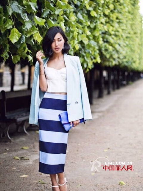 搭配要点:纯白色吊带胸衣+蓝白条纹铅笔裙+浅蓝色小西装+白色系带高跟鞋+宝蓝色手拿包