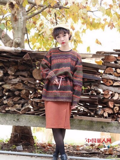搭配要点:彩色条纹宽松上衣+橘红色铅笔裙+橘红色皮带+黑色丝袜+黑色牛津鞋+米色画家帽