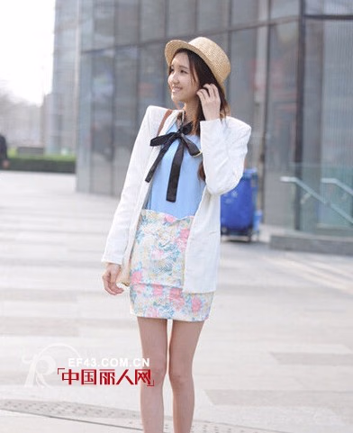 湖蓝色的雪纺衫搭配高腰印花包臀裙,外套一件白色的小西装,穿上一双香芋紫色的尖头高跟鞋,背上一个米白色的小包,戴上一顶可爱的草编小礼帽,整套搭配清新脱俗,尽显优雅气质。