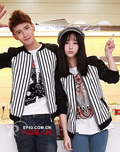情侣出游穿情侣装当然是最养眼的搭配了,就如此款的黑白竖形条纹的棒球外套,款式非常的个性时尚,简单的搭配上一件白色的T恤+牛仔裤,就可以让女孩穿的帅气,让男孩穿的阳光。