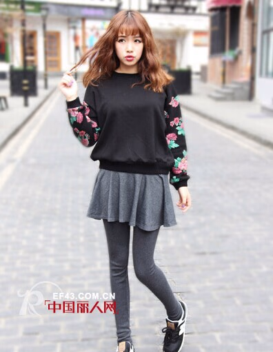 黑色卫衣修身显瘦效果极佳,而印花元素的加入打破了黑色卫衣的沉闷感,让它不至于让人觉得太过单调,搭配灰色短裙一起穿着休闲舒适,是蛮不错的一身秋装搭配。