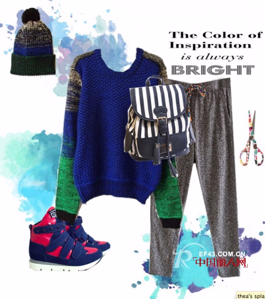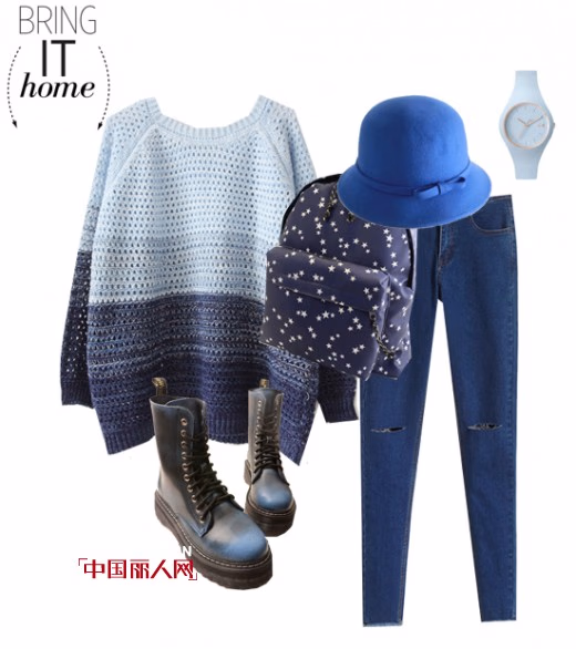 这款蓝色系的镂空拼接色的毛衣,宽松的版型加上清新自然的色彩拼接给人很柔和的亲切感,在深色时节可以直接外穿或是搭配衬衫穿着都不错。下身可搭配上紧身的破洞牛仔裤和黑色的马丁靴,在配上一个星空的帆布包,可爱又清新。
