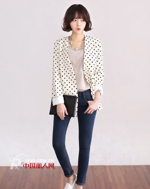 白色波点V领西装外套+杏色短袖T恤+蓝色牛仔铅笔裤+白色乐福鞋+黑色手拿包