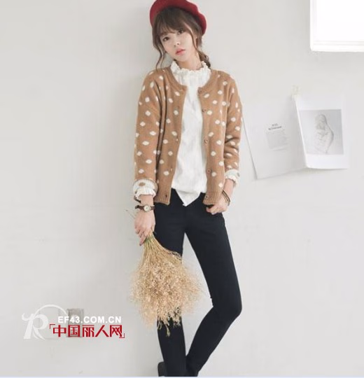 驼色圆领波点针织开衫外套+白色花边立领长袖衬衫+黑色低腰铅笔裤+棕色圆头方跟系带皮鞋+白色帆布字母印花帆布单肩包