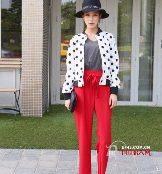 白色波点棒球服+深灰色T恤+红色高腰哈伦裤+金属拼接尖头平底鞋+黑色手拿包