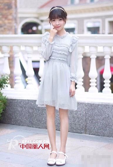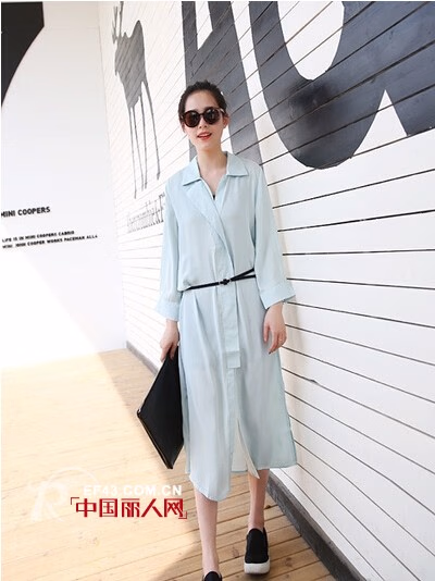 淡雅的浅色调衬衫裙,雪纺面料,长袖款是,优雅知性的风格,穿在身上很有时尚感。系上黑色小腰带,搭配平底鞋,拿着黑色手包,如此简单大方的着装,一样能穿出迷人气质。