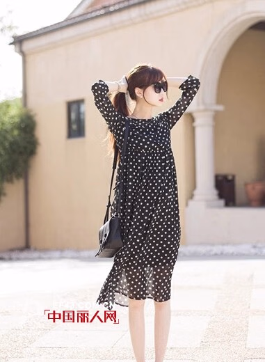 白色波点黑色长袖连衣裙,复古文艺范儿,经典不败的设计风格,穿在身上大方有型,搭配黑色厚底鞋和同色系单肩包,绝对时髦。