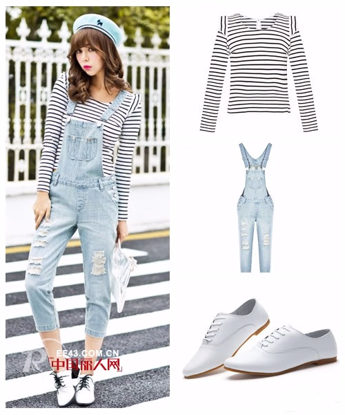 条纹T恤+浅色破洞牛仔背带裤+白色小皮鞋,这一身搭配虽然不能够将你的身高“提升”多少,但可以给你一种小女生的感觉,棒棒哒……