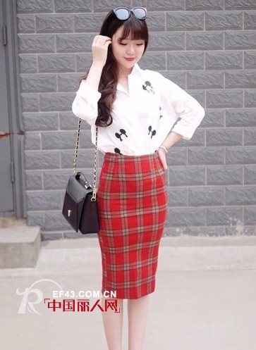 白色衬衫,经典不败的设计,穿在身上简单好看,给人的感觉格外的清新秀气,搭配红色格子半身裙,是铅笔裙的设计,勾勒出曼妙身姿,穿着大红色平底鞋,链条包,干练优雅。