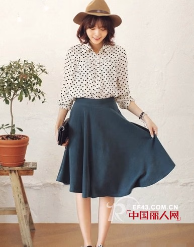 波点元素长袖衬衫,简约素雅的风格,带点复古味道,搭配深色系半身裙,穿上帆布鞋,戴着帽子,格外有型,给人的感觉格外的舒服大方。
