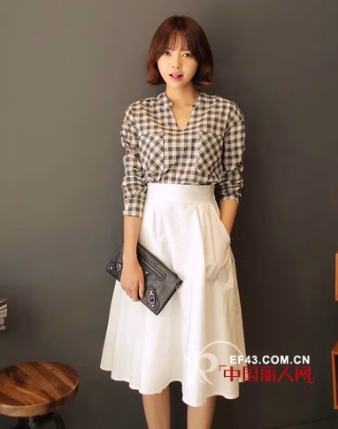 黑白灰格子衬衫,复古文艺范儿的风格,穿在身上格外小清新,搭配白色高腰半身裙,如此优雅大方的,轻松穿出都市OL的味道,踩着白色球鞋,大方有型。