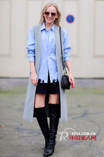 浅蓝色衬衫简约大方,略略带点BF风凸显出了中性风的时尚魅力,搭配灰色长款马甲一起穿着增添了整体造型的层次感,然后再加上黑色长靴和黑色短裤一起,露出部分大腿增添了几分小性感,而黑色及膝长靴也让整体造型的帅气指数upup!