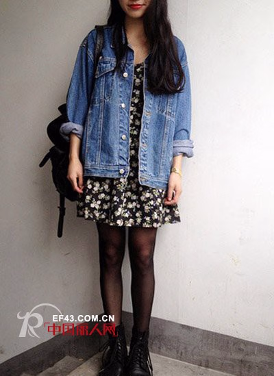 小碎花连衣短裙搭配牛仔外套的搭配是小清新的绝配装备,怎么样都瞬间如清风拂面,大诶黑色丝袜和马丁靴,又多了一丝酷劲。
