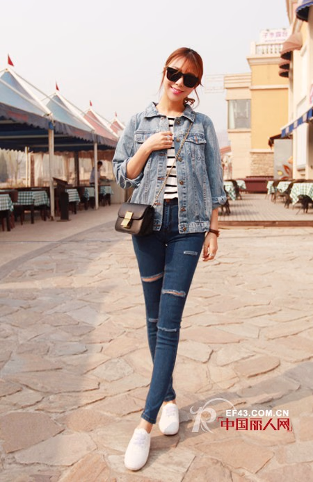 曾经大热的破洞牛仔裤今秋又席卷而来了。牛仔铅笔裤,破洞的款型为这条牛仔裤增色了不少,搭配上黑白条纹的T恤,外搭一件牛仔外套,简约又帅气,加上白色的帆布鞋舒适舒适感爆棚,黑色的复古墨镜点缀,韩范儿十足!