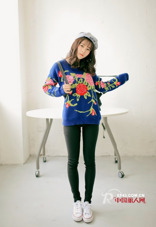 复古的宽松毛衣,个性的花朵让这件毛衣别有一番味道,搭配上黑色的铅笔长裤,层次清新分明非常的显瘦。加上一双白色帆布鞋,更加增添休闲度,背上一个双肩包,清纯可爱的校园风搭配,就活生生的演绎出来了!
